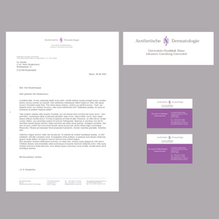 Hautklinik Mainz Realisierungen: Signet, Visitenkarte und Briefbogen für die Abteilungen Medizinische Camouflage, Dermatologische Kosmetik Lasertherapie und Aesthetische Operative DermatologieKunde:Praktikumnote24, Köln